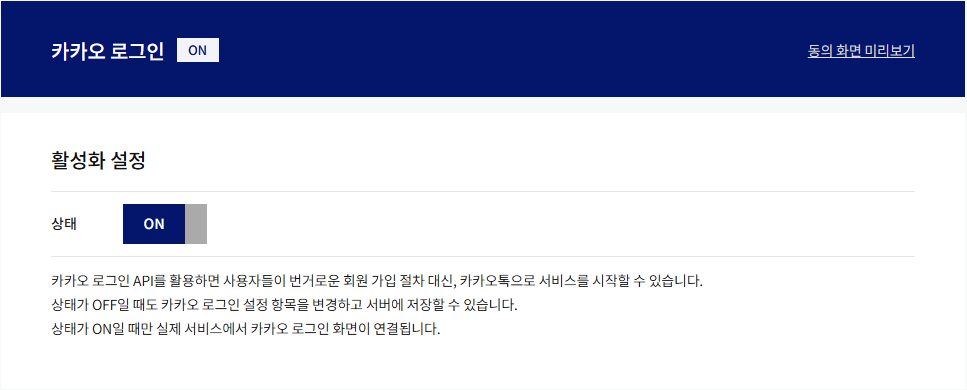- 제품 설정 → 카카오 로그인 → 활성화 설정